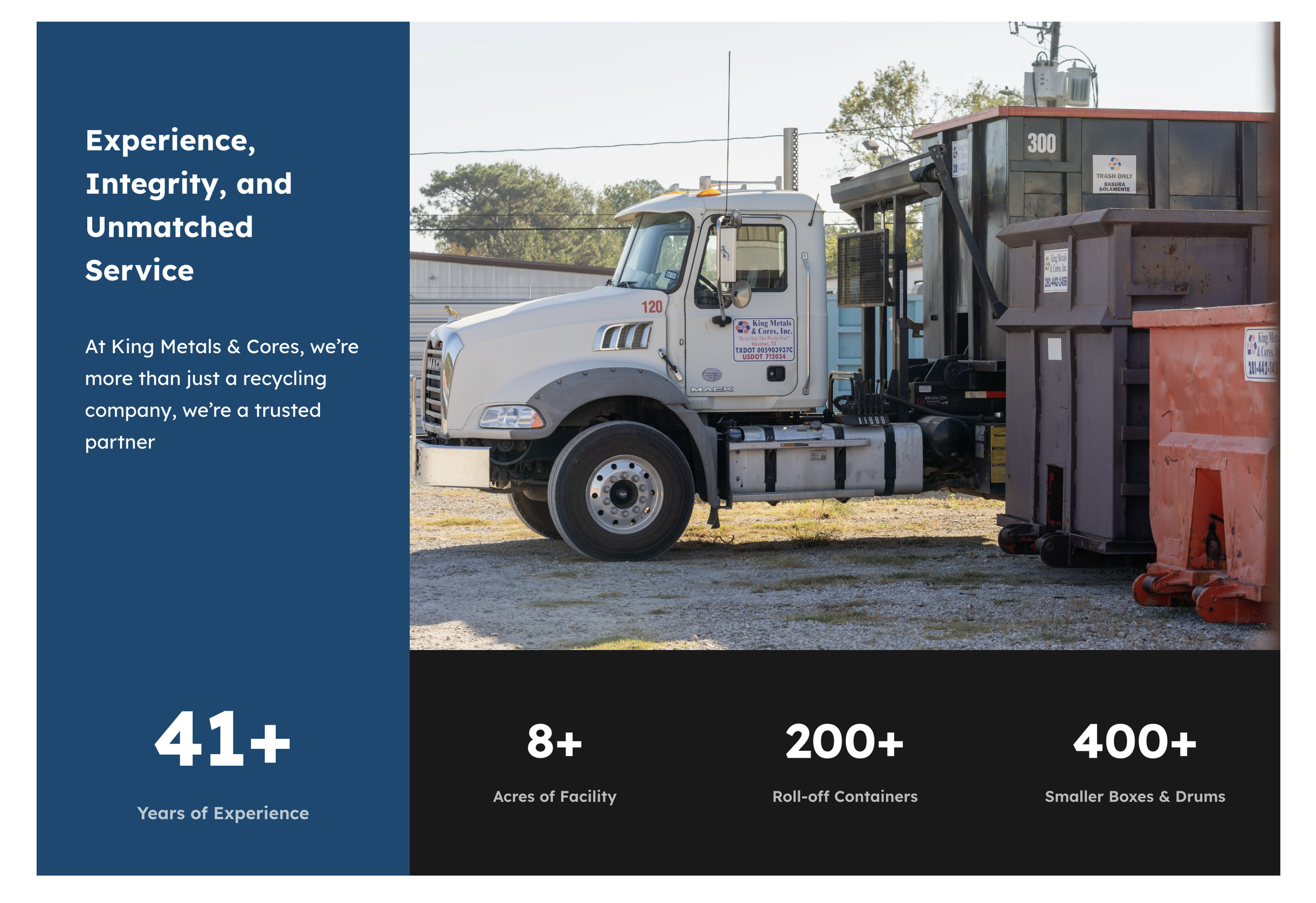 Challenge: King Metals & Cores needed a modern web presence that reflected the scale and professionalism of their operation. Their existing site felt dated, wasn’t optimized for local discovery, and wasn’t built to actively drive inbound business in a competitive scrap recycling market.